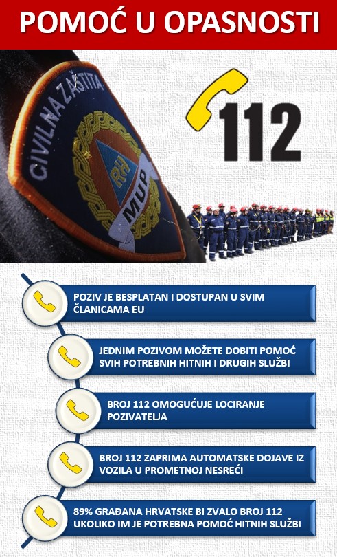 - Broj 112 građanima i turistima je dostupan 24 sata dnevno, a pozivi su besplatni sa svih javnih telefonskim govornica, mobilnih ili fiksnih telefonskih priključaka te se može zatražiti pomoć bilo koje hitne službe